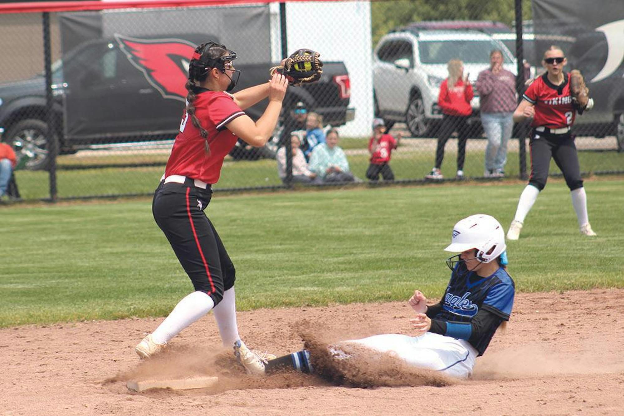 Whitehall shortstop Janie Fagan gets a force out at second base as Oakridge's Tomi Jo Jimenez slides into the bag during Saturday's district semifinal in Whitehall. The Vikings lost, 11-2.